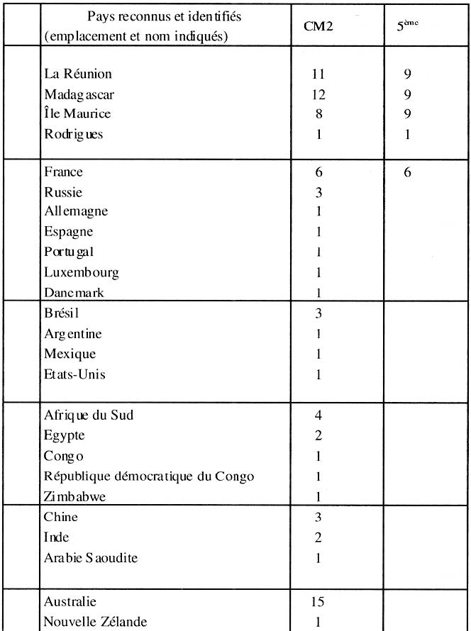 Les pays les mieux représentés et nommés sont les îles de l’océan Indien : la Réunion, Maurice et Madagascar. Elles semblent indissociables et sont remarquablement bien positionnées dans leur environnement du sud-ouest de l’océan Indien. Mais les Comores, Mayotte et les Seychelles n’apparaissent jamais. Seule Rodigues est située une fois en CM2 et en 5ème. Par contre, l’Australie est identifiée 15 fois ; elle est associée à un véritable continent par les élèves et délimite bien l’extrémité orientale de l’océan Indien. La France apparaît ensuite avec 6 localisations en CM2 et en 5ème. 13 productions d’élèves de l’école L. Dierx ont positionné au moins une fois un pays alors qu’en dehors de la zone du sud-ouest de l’océan Indien, les enfants de la Saline n’en ont positionné aucun. Pour ces élèves du CM2, outre la France, 6 pays d’Europe ont été recensés : la Russie (3 fois), l’Espagne, le Portugal, l’Allemagne, le Danemark et le Luxembourg (chacun une fois). Cinq pays d’Afrique ont été nommés : l’Afrique du Sud (4 fois), l’Égypte (2 fois), le Congo, la République démocratique du Congo et le Zimbabwe (chacun une fois). Paradoxalement, les pays du continent américain sont peu positionnés, alors que le continent a souvent été bien localisé et dessiné : le Brésil (3 fois), l’Argentine, le Mexique et, plus étonnant, les États-Unis (une seule fois). Seulement trois pays asiatiques (la Chine, l’Inde et l’Arabie) complètent cette ouverture sur le monde des élèves de CM2. Ces localisations sont à mettre en relation avec le vécu des élèves – très souvent voyages réalisés avec les parents.