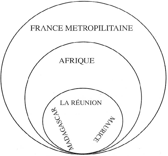 C’est bien son environnement immédiat qui prime chez l’élève. La même étude menée par Maryse Clary à Montpellier3 montrait un européanocentrisme affirmé avec des localisations à 100 % exactes pour la France. On peut affermer, à la lecture de ces productions que l’élève de La Réunion se localise par auréoles successives : Sud-ouest de l’océan Indien, Afrique, France (croquis n° 1). Les lieux familiers ont donc plus de valeur pour les élèves ; une différenciation spatiale des valeurs attachées aux lieux et espaces s’opère assez logiquement.